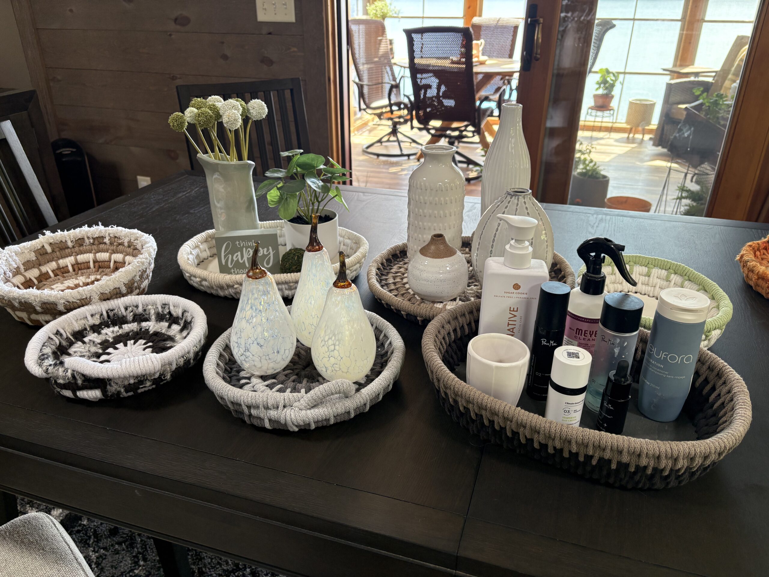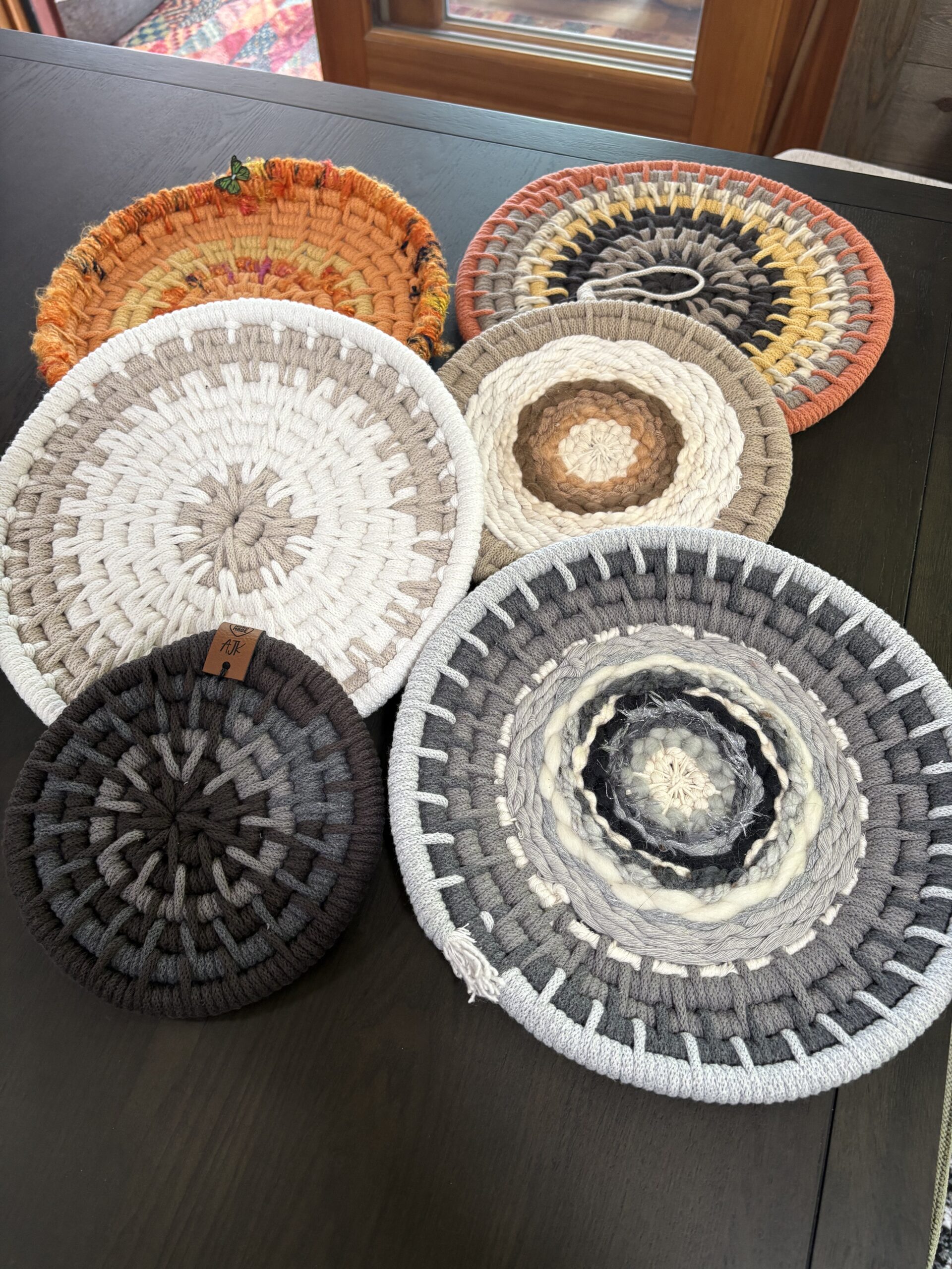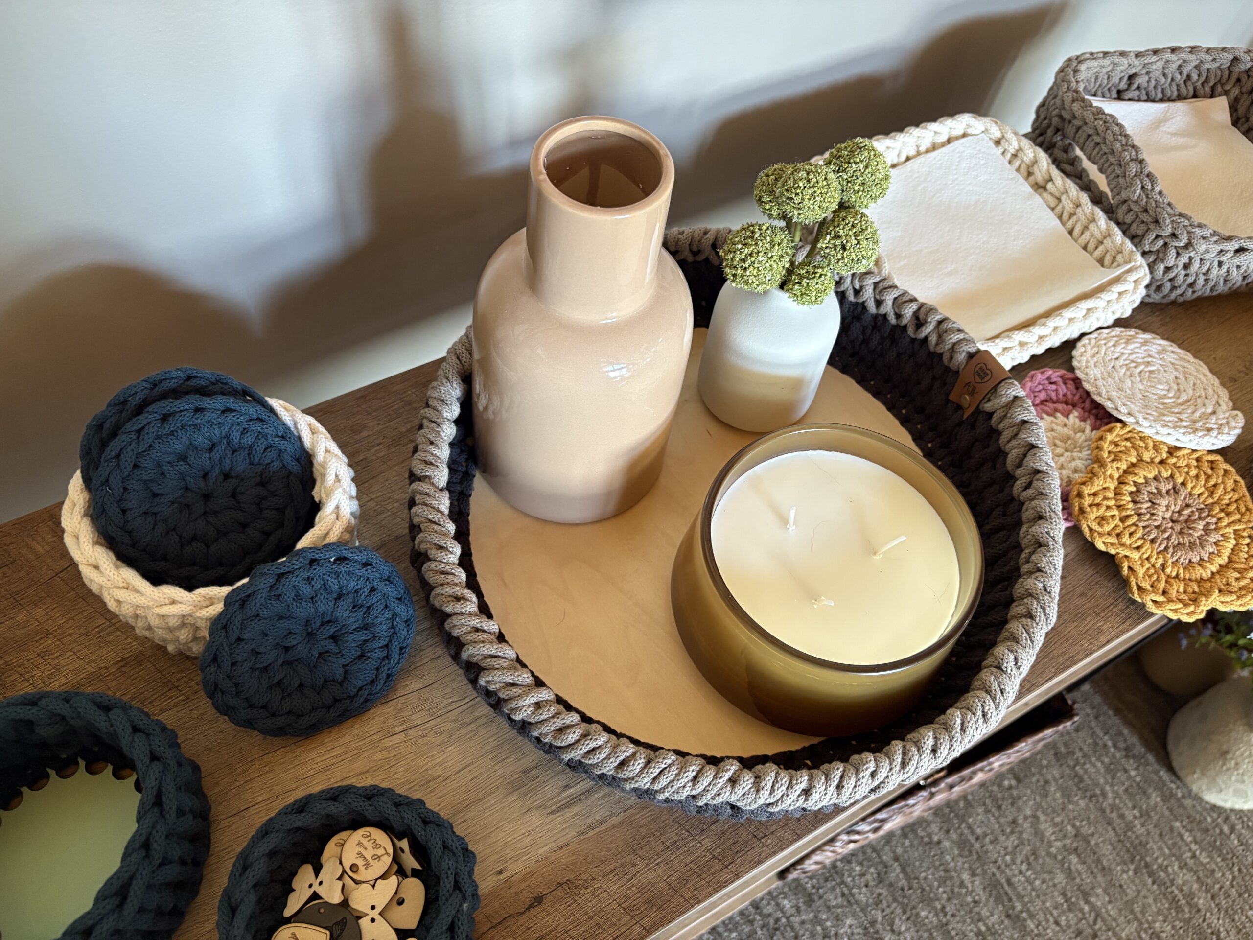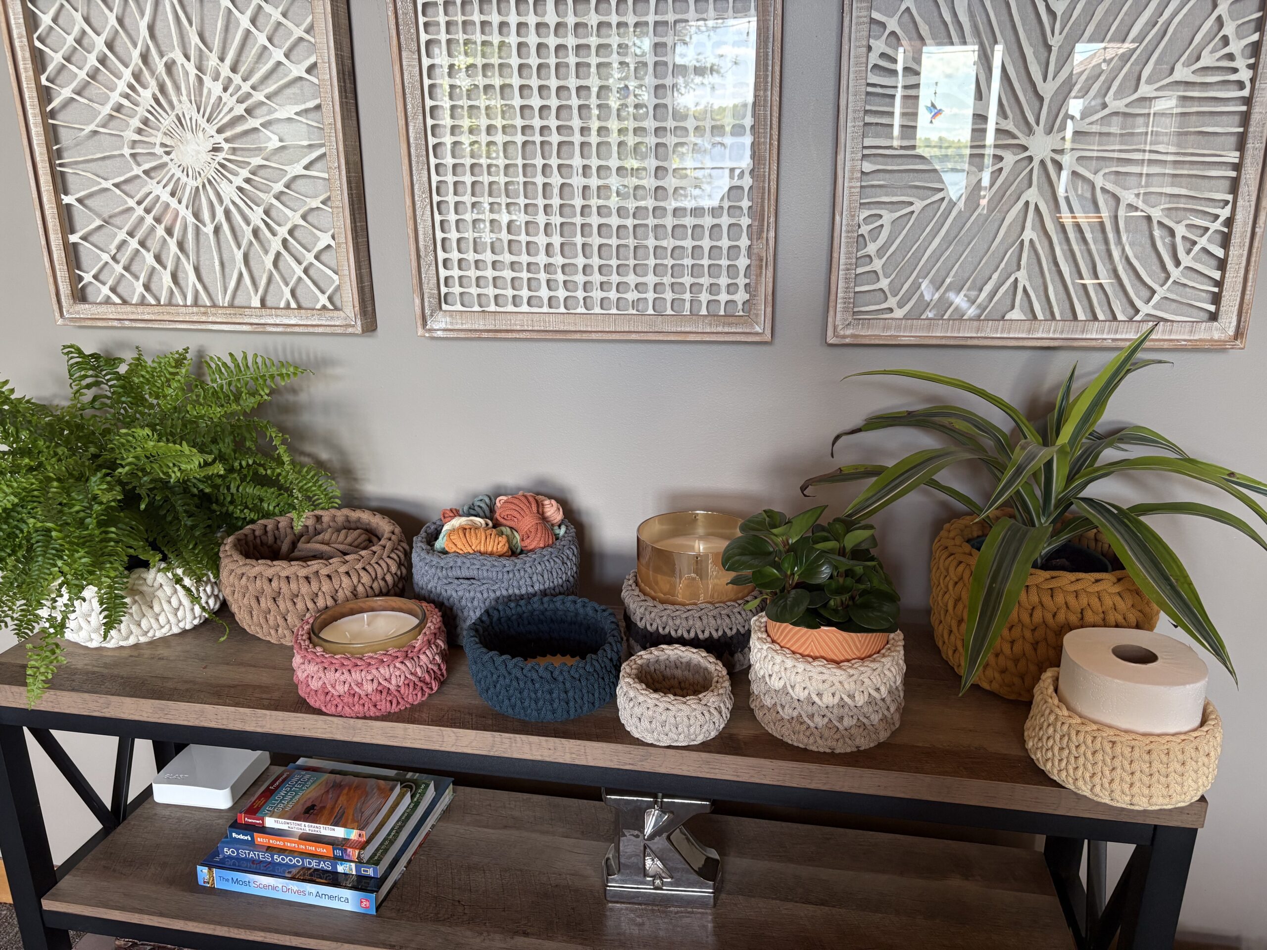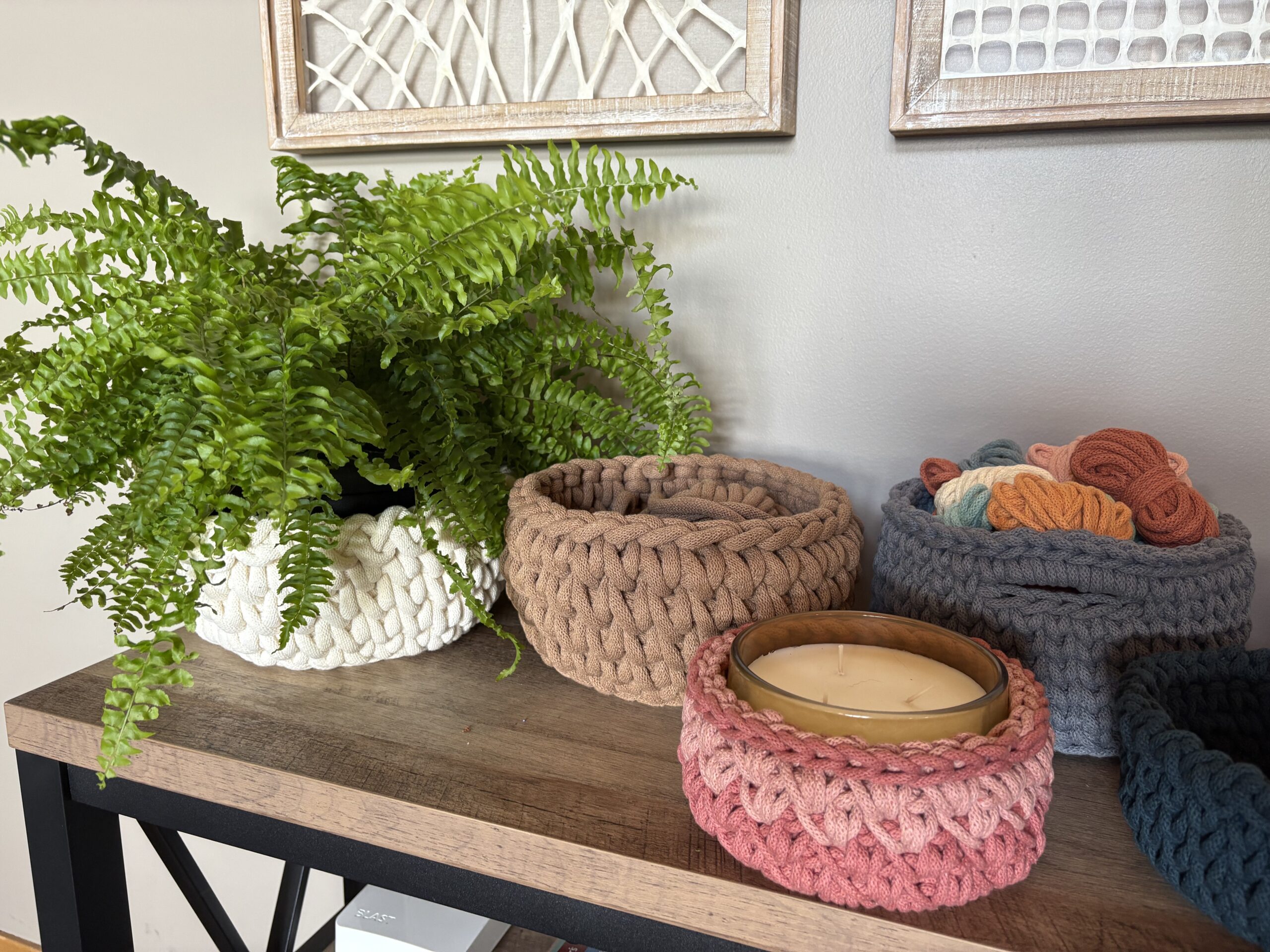 Today, Amy specializes in crafting distinctive and unique home decor pieces using eco-friendly materials such as recycled cotton macrame string, braided cord, and thoughtfully selected fabric and yarn accents. Her collection includes baskets, bowls, trays and napkin holders, trivets, and other items reflecting her commitment to sustainability, functionality, and artistic design