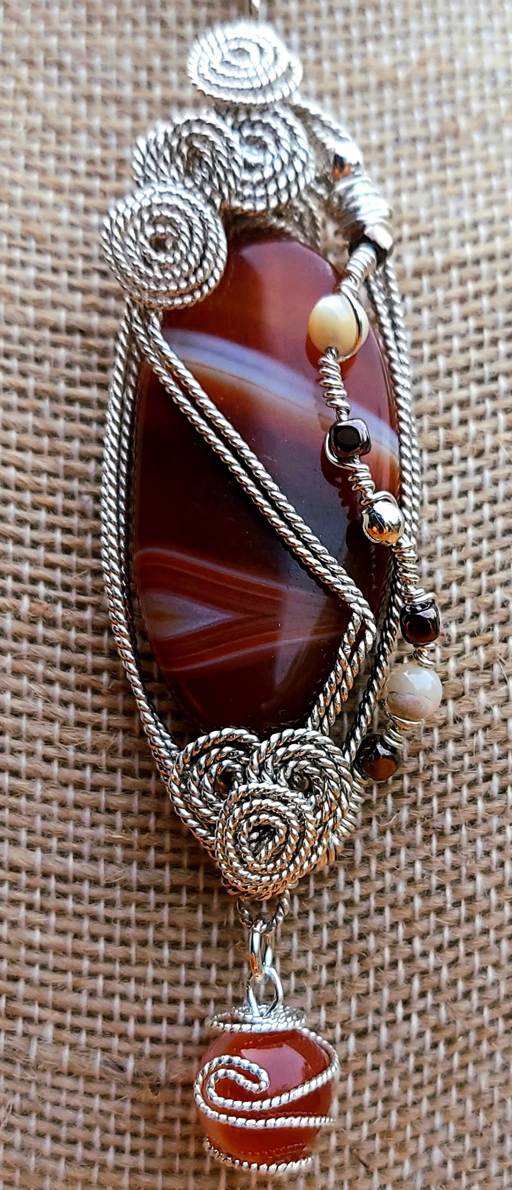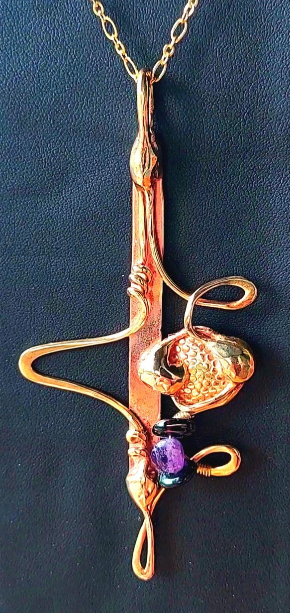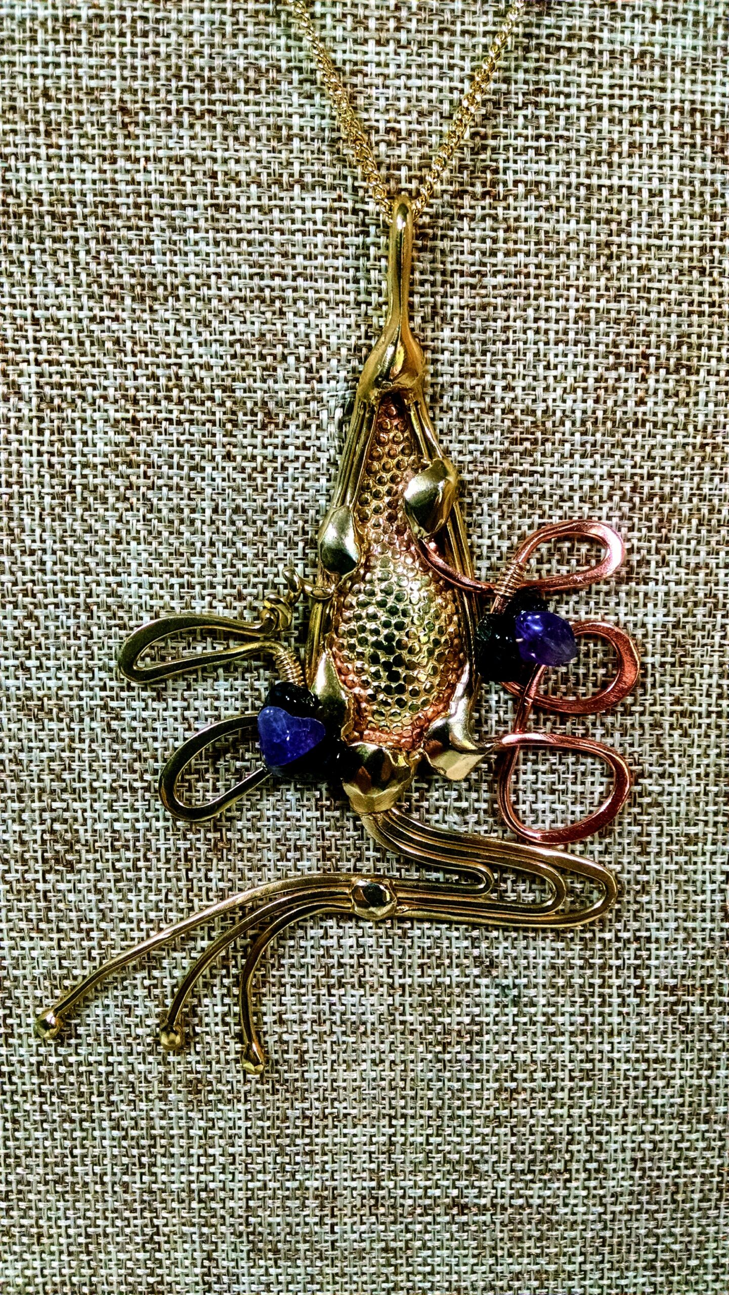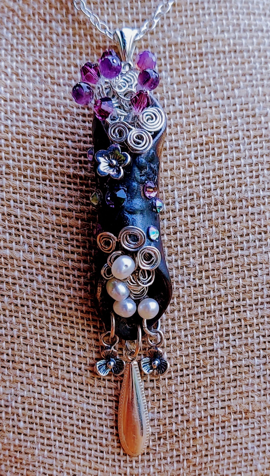 His wife, Anne Carlstrom, discovered her artistic side during the pandemic. Painting and pour painting at first then moving to jewelry making. She uses reclaimed jewelry pieces, hand-cut reclaimed leather, metal, fabric, rock, gems, wood and flowers from the garden. Always adapting and changing styles, Anne has found her true passion.