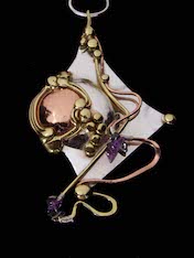 Sharon’s tree holders are hand twisted wire trees with slots or loops hand formed on the branches. Trees are wired onto the rock base and finished with a clear coat finish. Other holders are hand formed from thicker wire. Necklace hooks are formed using a homemade jig. Wire loops are formed using a round nose pliers. The two are connected by wrapping them together with very thin wire.
