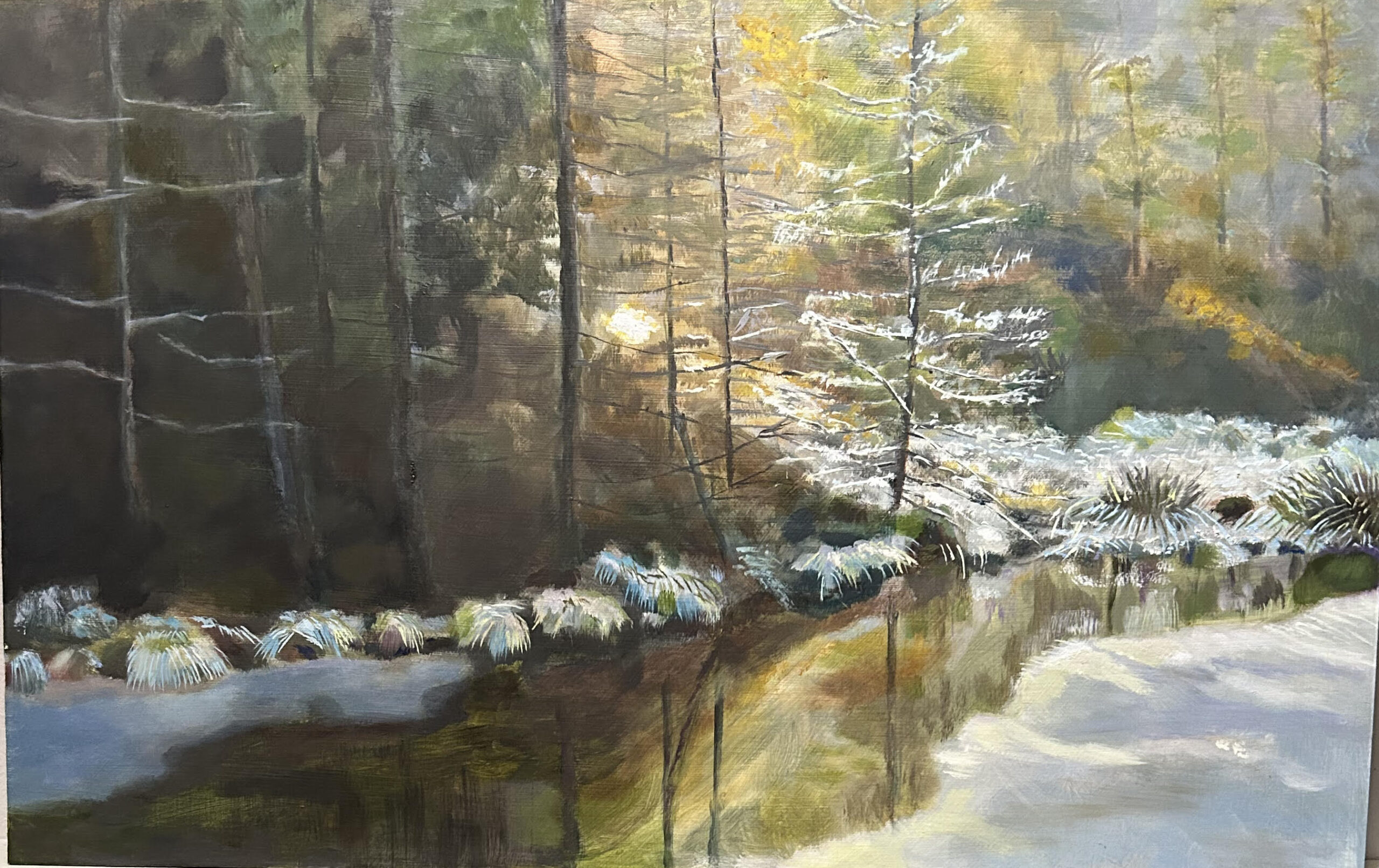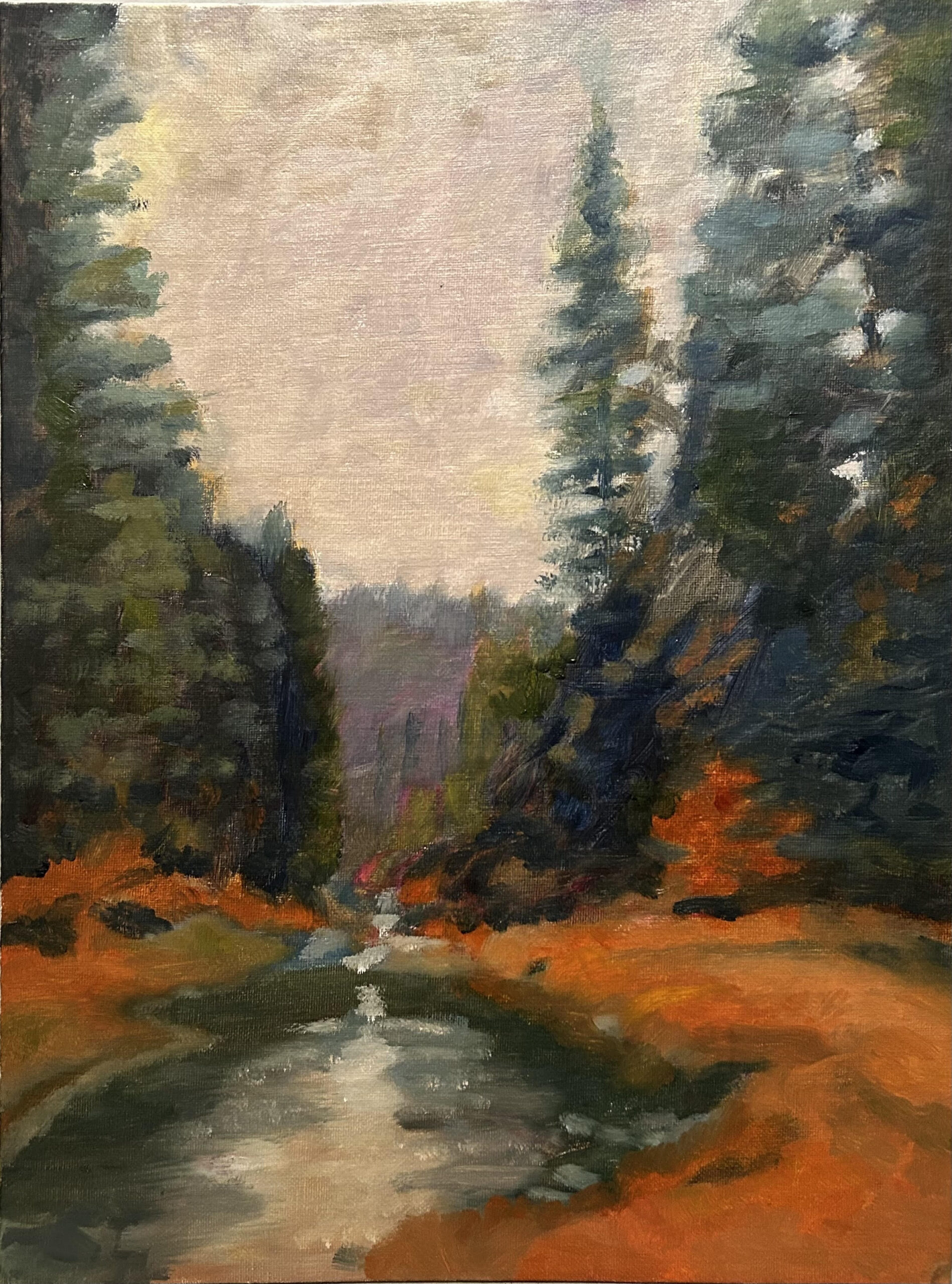 She started out exploring drawing and printmaking, expressing her vision through surrealism and symbolism, moving toward more representational styles later on. Lara lived and worked in Denver, Colorado for many years, returning to her home state of Minnesota in 2013. Currently, Lara lives in a tiny house in the woods north of Pine River, and is passionate about the wooded landscape around her. She works primarily in acrylics, painting small landscapes on canvas. Through her work, she is interested in exploring the light, colors, layers and textures of the northern forest. Lara states: “I keep working at capturing something of the striking as well as the more subtle beauty around me. I never feel I’ve quite succeeded, but that’s what keeps me painting!”
