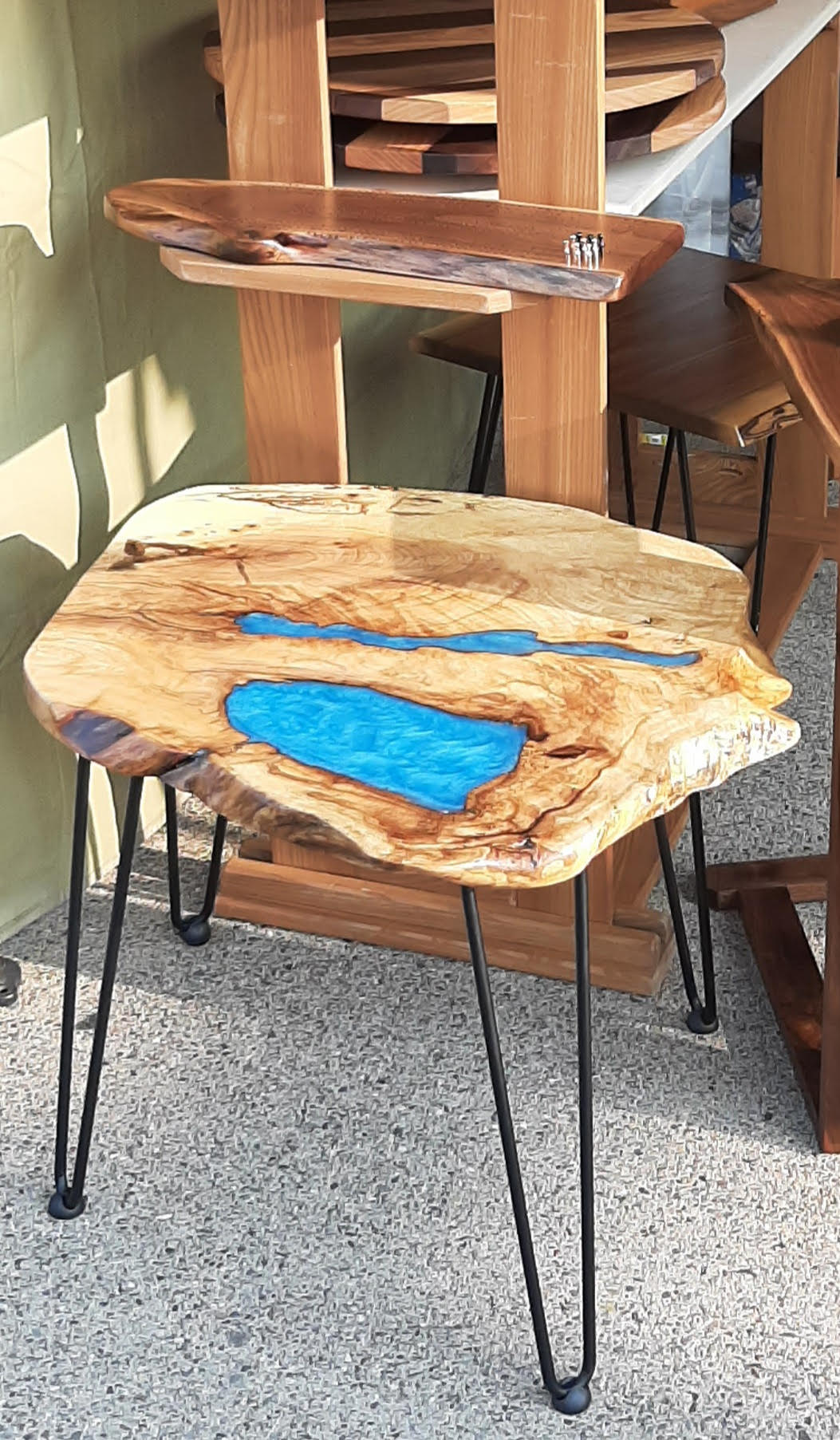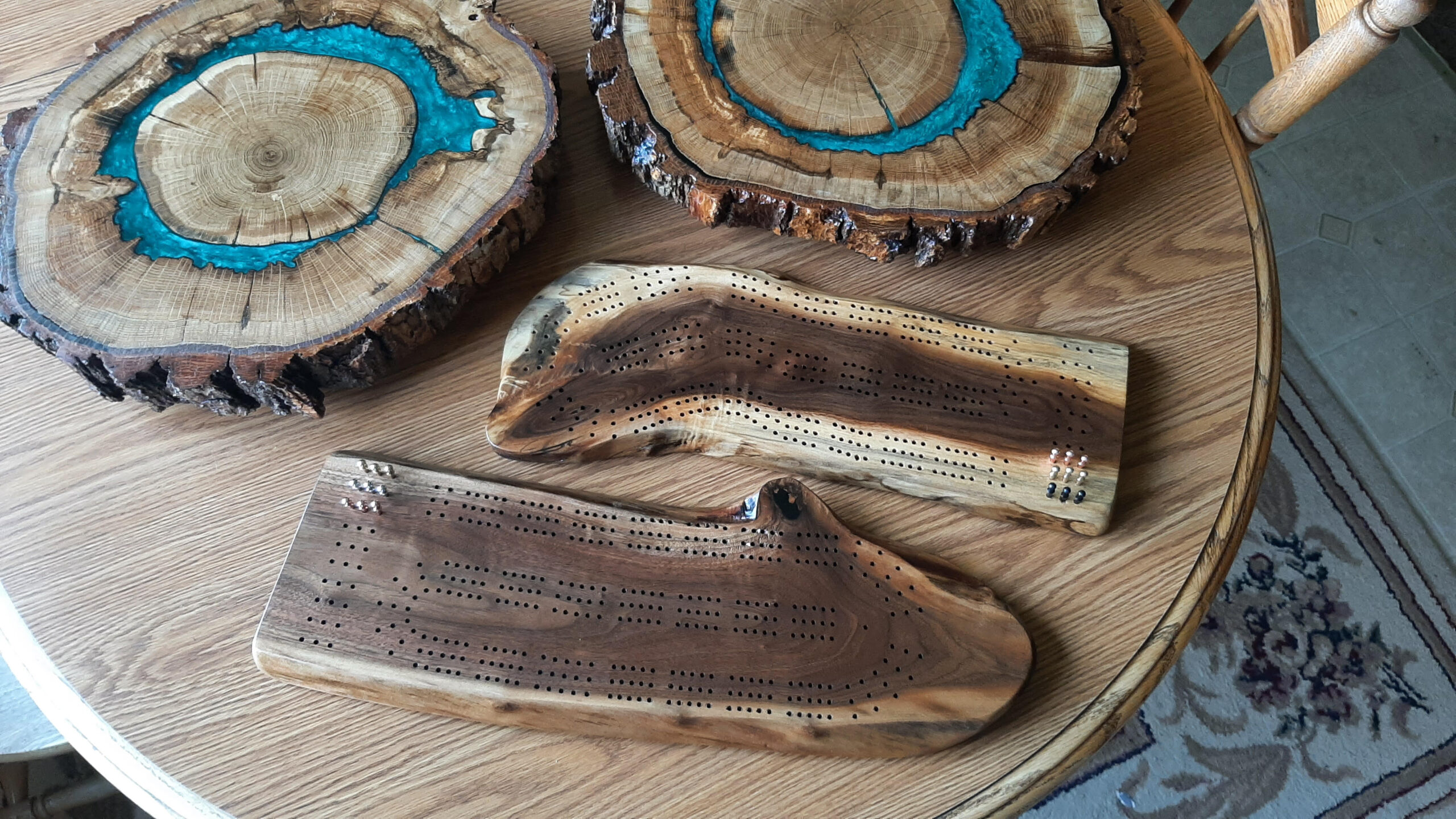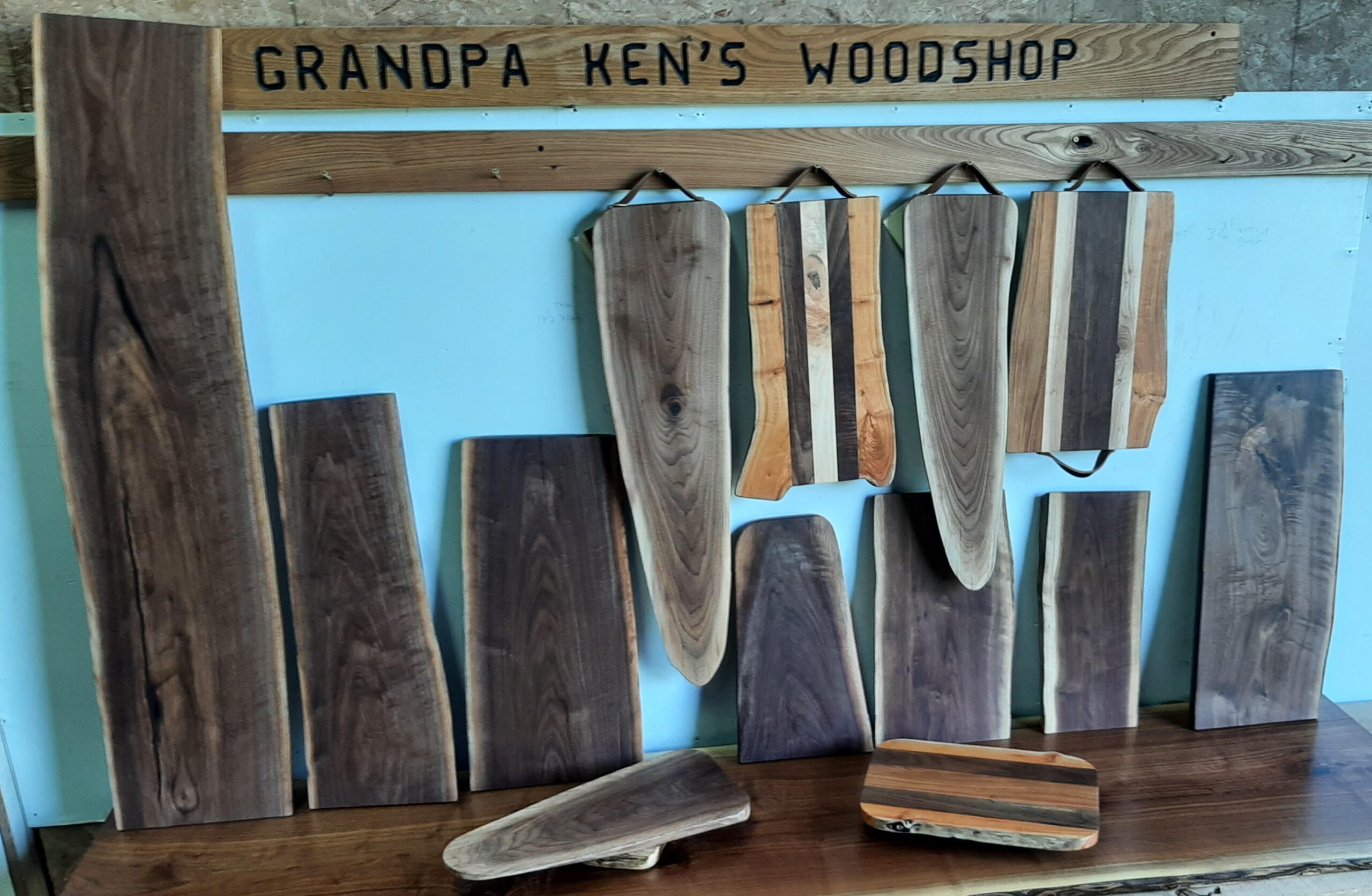Following a work accident in 2019, he decided to go more full-time into his woodworking dream. Ken starts with standing or newly fallen trees (mostly black walnut) which he cuts and mills and then goes to work plaining, assembling, sanding, and finishing, making many different kinds of live edge products. These include large and small tables, river tables with epoxy, lazy susans, charcuterie boards, urn boxes, cribbage boards, domino and card holders, and coaster sets just to name a few.